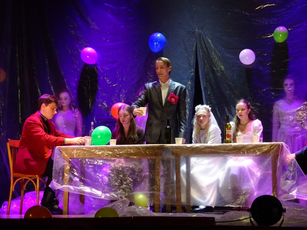 Впрочем, «мойры» могли бы предложить и другой вариант. Ещё до начала спектакля, когда зрители только входили в зал, на сцене уже стоял большой «стол яств», на котором лежала безжизненная девушка в одеянии невесты, а вокруг трапезничали люди. Как стало ясно потом, это родственники и близкие Дуняши; появился и кудрявый красавец в косухе, зарыдавший на груди у мёртвой девушки... Вот прозвенел последний звонок, и на сцену ворвались те самые «мойры», «парки», со смехом уселись за стол, а хозяин начал заздравную речь. Но тут из зала поднялся простой с виду парень, и... «расстрелял» всю эту компанию (привет, 90-е!). Потом-то стало понятно, что это Иван, друг детства Дуняши, который хоть и любил её, но готов был смириться с тем, что она-то любит другого, лишь бы Дуняша была счастлива. А этот «расстрел» как бы запустил историю заново, и сделали это не мифические мойры, а любящий человек. Так «погром» превратился в последствия пьянки купца, готового стать для Ивана сватом.