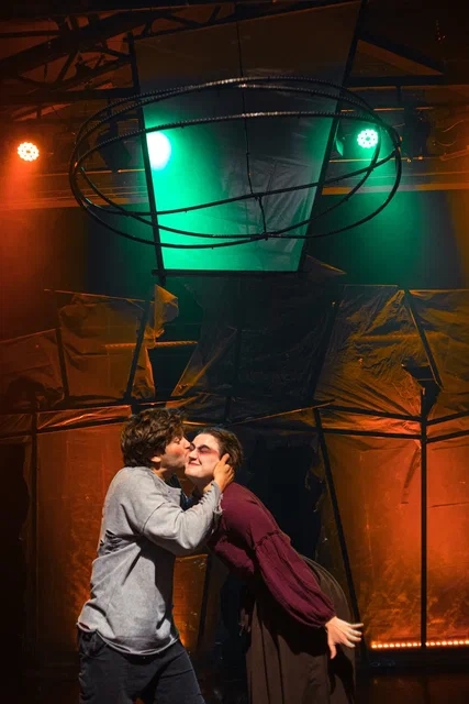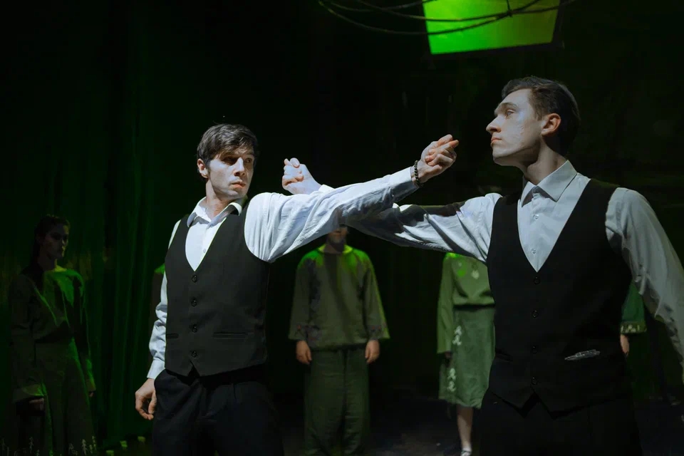 Тревожное ожидание усиливало и то, что в постановке Ивана Курамова сюжеты повестей развивались не линейно, а как бы параллельно, поэтому продолжение каждой истории замедлялось, делая ожидание развязки всё более тревожным, хотя начался спектакль не с мистической, а с сатирической истории про то, «Как поссорились Иван Иванович с Иваном Никифоровичем». Но и она продолжалась на протяжении всего спектакля: схватка двух Иванов (это Дмитрий Исаенко и Максим Савенко), ещё недавно бывших добрыми соседями, вклинивалась в ход других историй, ставя их на паузу. В конце мы увидели уже седобородых стариков, потративших жизнь на бессмысленную вражду.