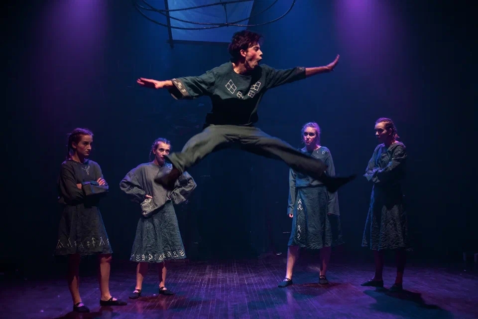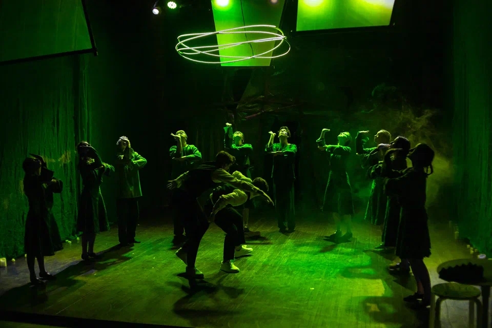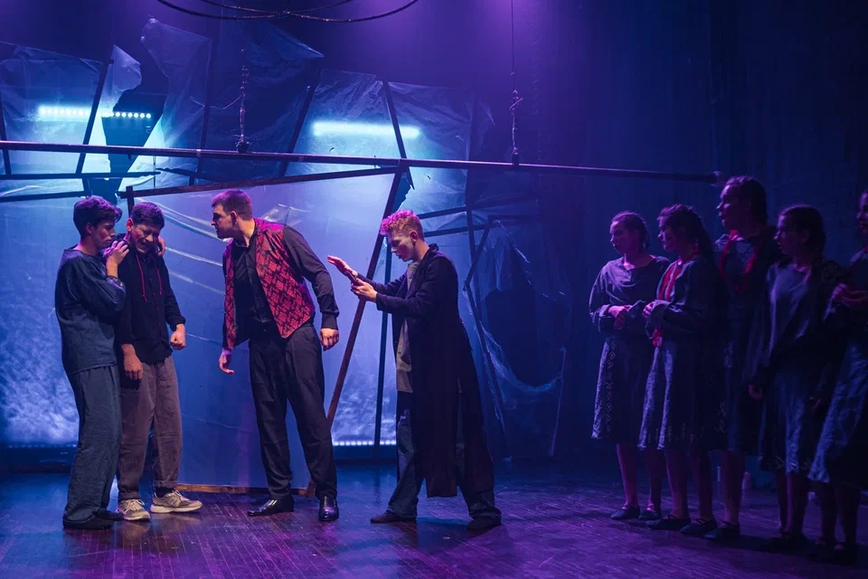 Тут, кстати, нет конкретного воплощения Вия, это некое коллективное зло: вместе с Панночкой сквозь светящиеся преграды на Хому наступает, корчась в странной нечеловеческой пластике, целый отряд тёмных сил. В массовых сценах участвуют студенты актёрского курса ОмГУ (среди зрителей был замечен их мастер Олег Теплоухов). Ребята сыграли не только нечисть, но и дворовых людей, и деревенских сплетников, и русалок... В целом, стали единым духом этих историй, тоже усиливающим ощущение тревожности.