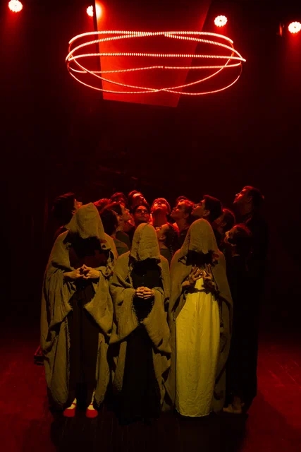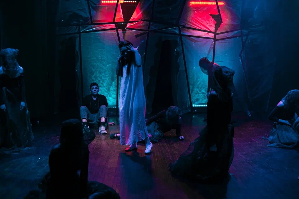 Были, конечно, и другие приёмы создания саспенса. Так, рассказчицами страшных историй стали три ведьмы в тёмных плащах с закрывающими их лица капюшонами. Такое решение позволило насытить спектакль авторским текстом Гоголя, а он нагнетать-то умел! Каждая из ведьм по ходу развития сюжета становилась то Панночкой (Ирина Бабаян), завещавшей Хоме Бруту (Александр Соловьёв) отпеть её после смерти; то Утопленницей (Полина Кремлева), ищущей среди русалок погубившую её мачеху-ведьму и призывающей на помощь Левко (Расим Раенбагин), влюблённого в Ганну (Мария Околелова); то Федоркой (Софья Потапова), которую отец не хочет отдать за бедняка Петруся (Виталий Храмов). Ведьмы, конечно, искушают людей, но каждый сам решает: поддаться искушению или устоять? Именно об этом говорит со зрителями Иван Курамов: «Зло творится нашими руками. Выбор делает человек. Он и ответственен за то, что происходит».