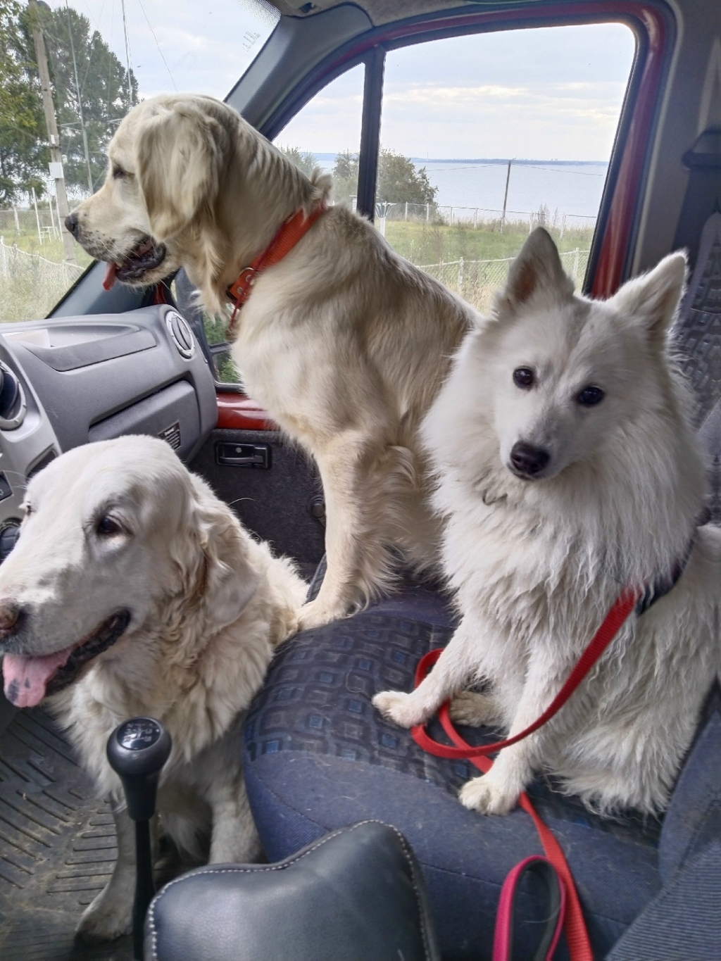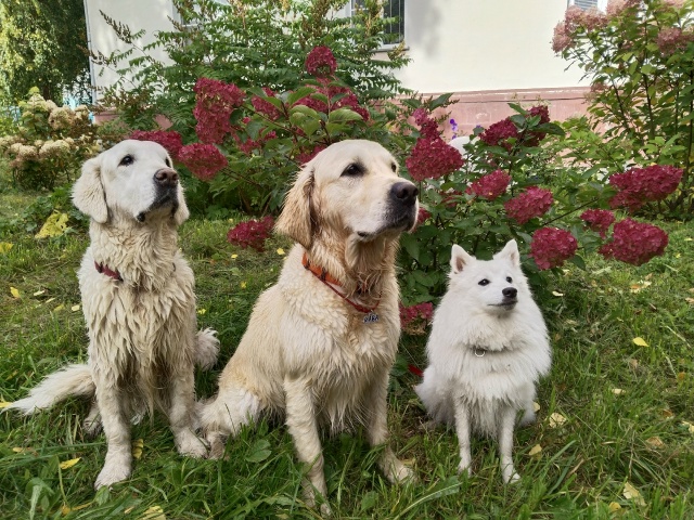 Итак, первый «шпицовый навык — это кусать за уши бедных ретриверов. Оба моих шпица освоили навык в совершенстве к совершенному расстройству моих обоих голденов. Доре широпопая недавно повредила ухо, Кава тоже стонет от этой «прищепки», но шпиц упорно дополняет уши старших собак серьгами в виде пушистой своей туши. Бесячий и вредный для ушей навык — первый в программе для обязательного шпицового изучения.