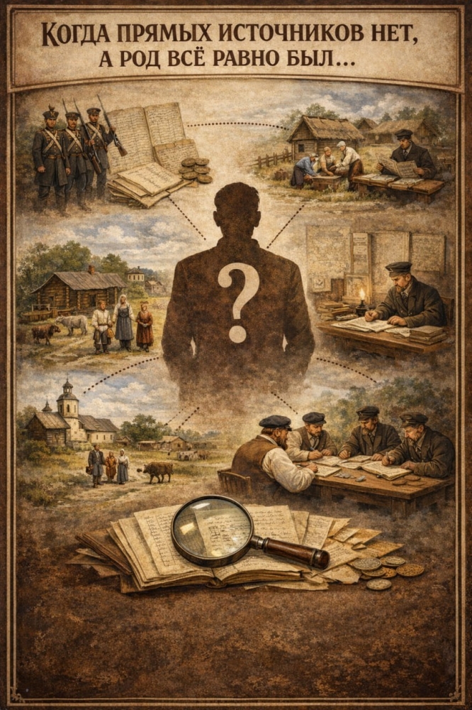 Есть момент в любом генеалогическом поиске, который переживают все. Сначала спокойно, потом с раздражением, потом почти философски. Человек жил. Семья есть. Дети есть. Деревня та же. А по прямым источникам — пусто. Нет метрики. Нет ревизии. Нет исповедной ведомости. Будто предок аккуратно прошёл между строк истории и никого не побеспокоил.