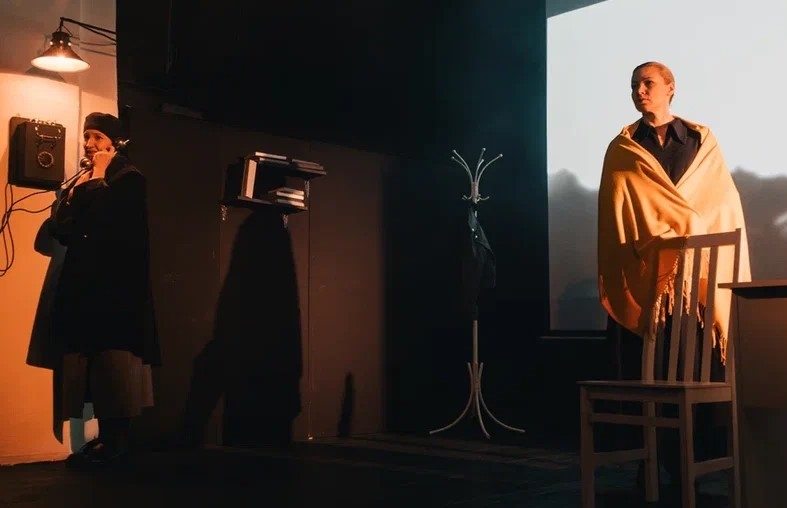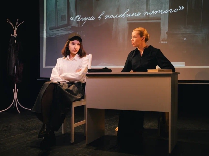 Но начинается всё в наши дни. Входя в зал, зрители видят на сцене вполне узнаваемый интерьер школьного класса: учительский стол, пара стульев, глобус, полка с книгами и то ли доска, то ли экран. Впрочем, теперь учителя нередко закрывают доску экраном для демонстрации слайдов или видеопрезентаций по теме урока. Такую презентацию предлагают и рассаживающимся зрителям: на экране меняются портреты известных современников героинь: Гумилёв, Заболоцкий, Хармс, Клюев, Шаламов, Пильняк, Булгаков, Бабель... Рядом с каждым — краткое описание биографии: расстрелян; стоял у расстрельной стены; получил годы лагерей; умер на пересылке... Этот класс пуст, а где-то за стеной слышится весёлый гул детских голосов: возможно, сейчас перемена.