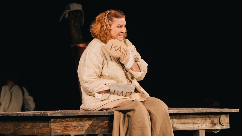 Днём зрители увидели спектакль Курганского театра драмы «Хорошо жить» (16+). В его основе — глава «Крестьянка» из поэмы Некрасова «Кому на Руси жить хорошо». Актриса Любовь Савина прожила не только судьбу крестьянки Матрёны, но и, например, старика, бывшего каторжника. Остальные герои её рассказа были обозначены предметно: на больших рукавицах написано «мама» и «папа», Матрёна надевает их, и вот уже самые родные люди обнимают её. Имя мужа, кирпичных дел мастера, обозначено на кирпиче, но для неё этот неодушевлённый предмет — живой. А вот сынок у неё — и вправду живой: у актрисы здесь есть сорассказчик — актёр Алексей Березовский. Вначале он лишь помогает рассказчице: подаёт реквизит, создаёт шумовое оформление, ритмом своих движений задаёт темп. Но постепенно становится всё активнее. Так, когда Любовь Савина погружается в образ каторжника, Алексей Березовский задаёт ему вопросы как бы от имени Матрёны: это ведь она с ним беседует. Да и зрители, порой, участвуют в действе: бесконечно длинное белое полотнище, как метель, «заметает» зрителей первых рядов. Не знаю, сочтут ли эксперты работу режиссёра Вячеслава Зайчикова моноспектаклем, но постановка получилась интересная.