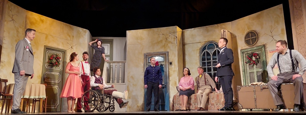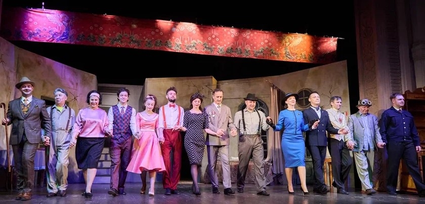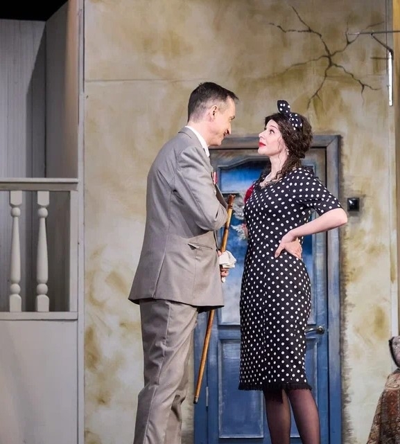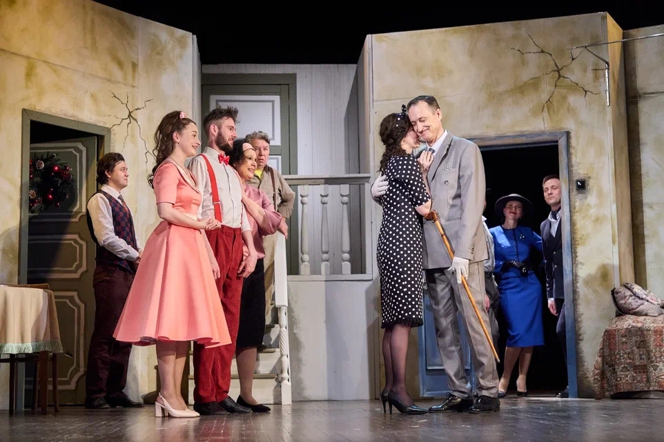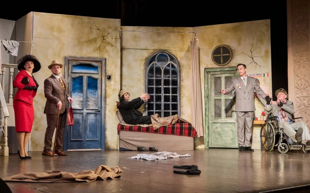 В-пятых, не могу не отметить оформление спектакля. Художник Леонид Подосенов (Москва) самыми скромными средствами создал тесный для большой семьи Леонидо дом, но в то же время — уютный. Здесь и происходят все приключения героев. Старенькая мебель и афиша с портретом Робертино Лоретти на стене создают ретро-шарм, помогают перенестись во времена, когда создавалась эта история. Способствуют этому и костюмы: светская дама появляется в разных нарядах и шикарных шляпках, соответствующих моде 60-х годов прошлого века. Ярко и даже дерзко одета дочка Леонидо: Лючия щеголяет в укороченных узких брючках и пёстрой блузке. Соответствует стилистике спектакля и музыкальное оформление: композитор Дмитрий Бедунов основной музыкальной темой сделал зажигательную тарантеллу.