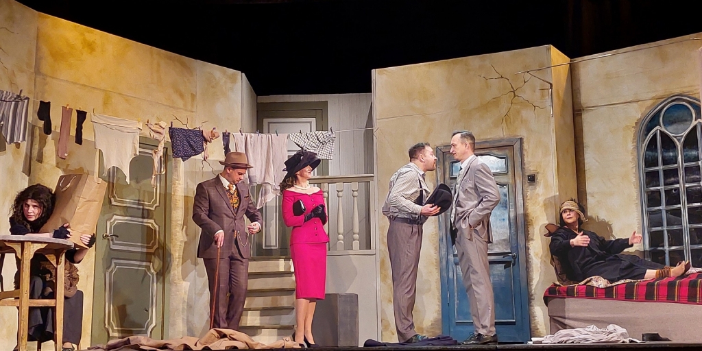 В-третьих, актёры явно наслаждаются, перевоплощаясь в итальянцев, представителей разных социальных групп. Главные герои тут — бедняки, выживающие лишь благодаря тому, что талантливый глава семейства «работает» гостем на светских мероприятиях, где под шумок выносит в потайных карманах еду и напитки. Виталий Романов утверждает, что его герой Леонидо близок ему своим жизнелюбием, и актёру нравится, что в ходе свалившихся на его голову приключений Леонидо преодолевает свой инфантилизм. Жена Леонидо Катарина (Екатерина Романив) даже в домашнем халате (впрочем, очень элегантном) выглядит, как звезда итальянского кино; некоторые из знакомых, побывавших на прогоне, даже сравнили её с Софи Лорен. А сестра Леонидо Матильда (Ольга Серман) хоть и всего лишь моет театральные туалеты, но по-настоящему преданный театру человек. Возможно, в ней спит настоящая актриса: неслучайно она отлично справляется с ролью умирающей, которую ей отвёл брат.
