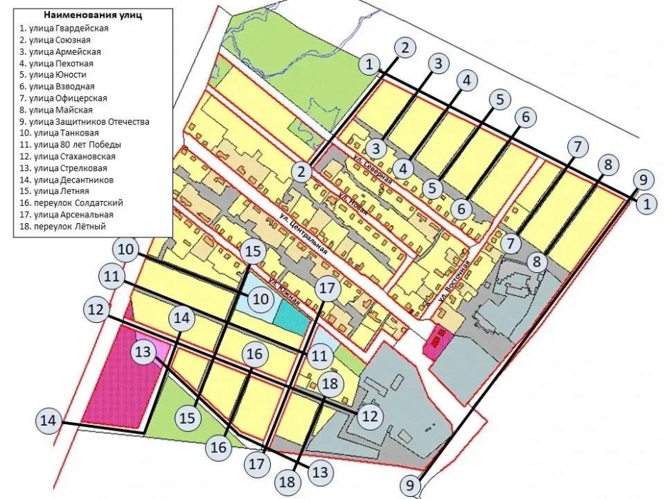 Улицы: Гвардейская, Армейская, Офицерская, Союзная, Пехотная, Взводная, Юности, Майская, Защитников Отечества, Танковая, 80 лет Победы, Стахановская, Стрелковая, Десантников, Летняя, Арсенальная