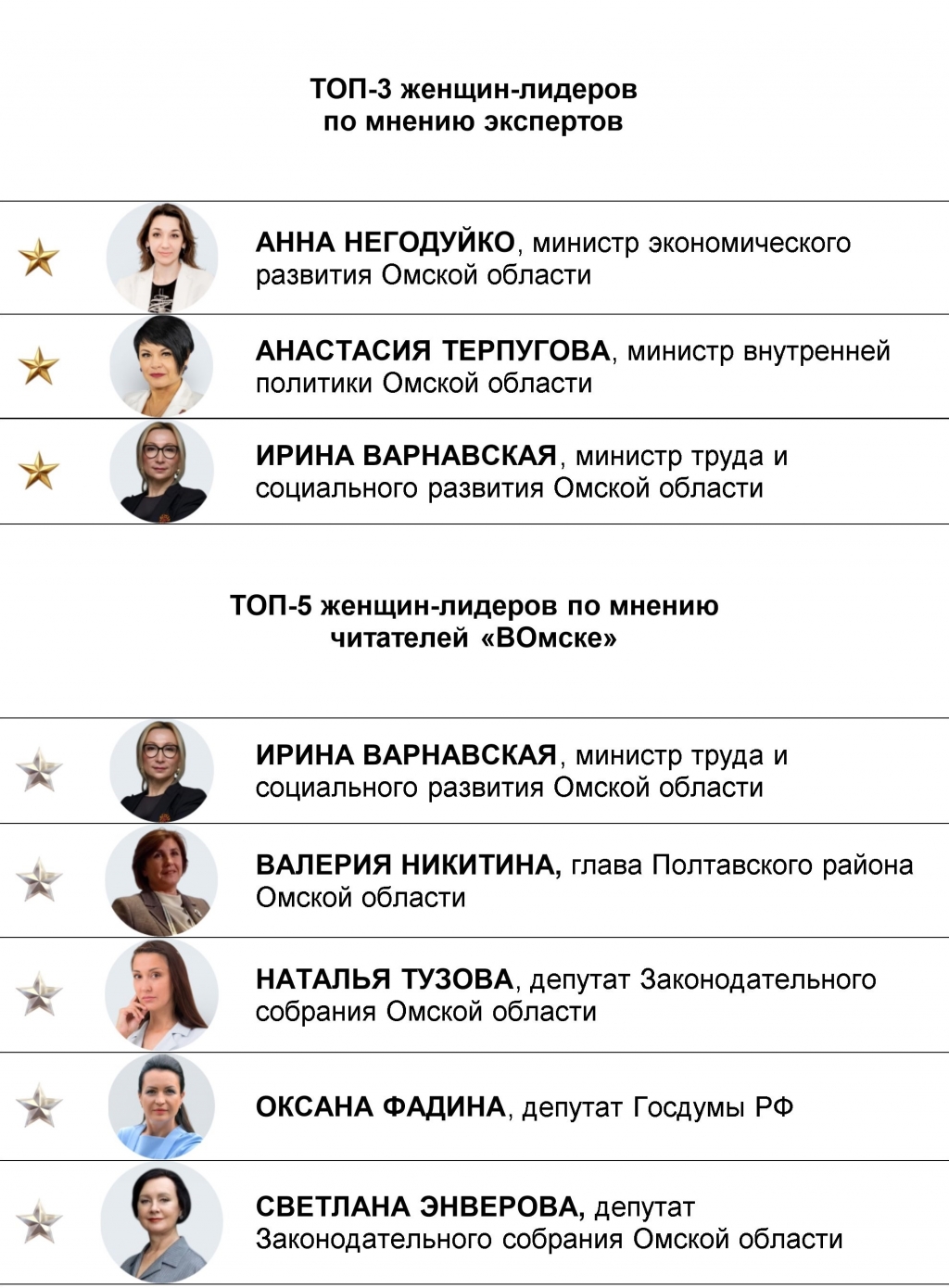Сразу скажем — оценка экспертов во многом сошлась с народным мнением, но не на все 100% — были и нюансы. С итоговой «золотой сотней» в полном составе вы можете познакомиться в таблице ниже, мы же кратко пройдемся по обеим — народной и экспертной — версиям топ-3 лидеров в каждой номинации. За одним исключением — в народном голосовании по лучшим представительницам прекрасного пола в политике и органах власти омичи проявили настолько большую активность в поддержке разных кандидатов, что очертить жестко именно тройку лидеров нам не удалось — в качестве исключения в этой номинации выделяем топ-5 (здесь лидеров голосования мы расположили по алфавиту).