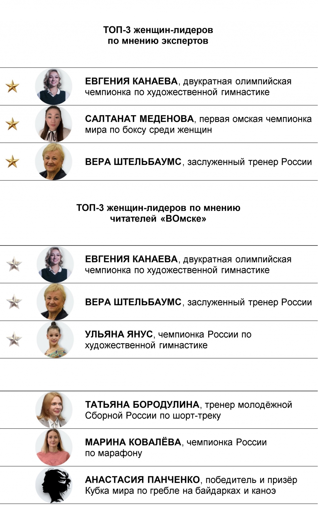 Таким же безоговорочным №1 как хоккей в «мужских» видах спорта, для омских девушек является художественная гимнастика. Лишнее подтверждение тому — экспертный топ в данной номинации на 2/3 посвящен этому спорту, а «народный» — и вовсе на 100%. И в том, и в другом мы видим, во-первых, самую титулованную омскую грацию, первую двукратную олимпийская чемпионка и семнадцатикратную чемпионку мира Евгению Канаеву, под покровительством которой сейчас подрастает новое поколение «художниц», а во-вторых (только по алфавиту — так-то именно с неё всё начиналось) заслуженного тренера России Веру Штельбаумс. Воспитательница плеяды чемпионок в прошлом году активно содействовала обновлению регионального Центра художественной гимнастики и была удостоена звания Героя Омской области.