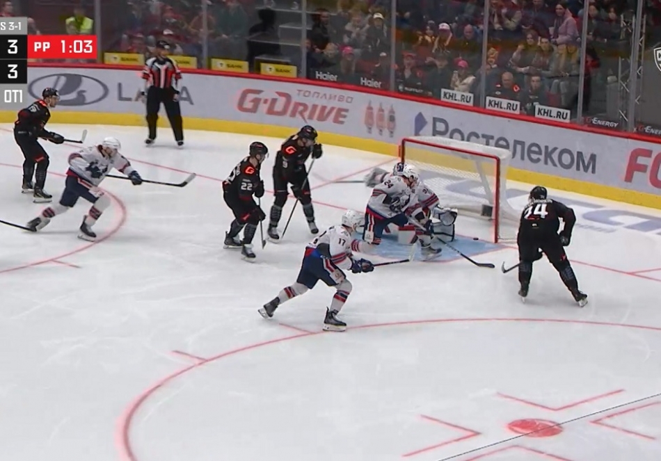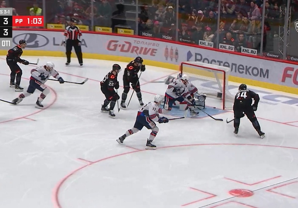 1Но все же это сработало буквально на последних секундах: Дамир Шарипзянов зарядил издали — из-за сломавшейся при этом клюшки капитана «ястребов» шайба пошла низом, не так сильно и чуть мимо ворот — как раз как передача дежурившему у левой штанги Окулову. А тот оперативно перекинул её на правый фланг, куда приехал совсем без опеки Николай Прохоркин, который и расстрелял безнаказанно пустой угол — 3:3 за восемь секунд до конца основного времени. Значит — снова овертайм.