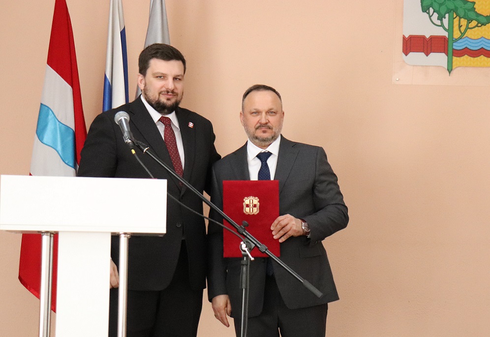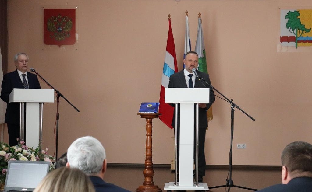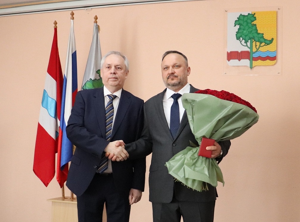 Председатель районного Совета Юрий Тетянников с пожеланиями крепкого здоровья, благополучия, хорошего настроения и профессиональных успехов вручил вновь избранному главе новое удостоверение вместе с парадным букетом темно-алых роз (единственное праздничное отступление), после чего начались поздравления.
