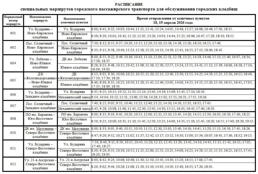 1- № 601 — ул. Бударина — Ново-Кировское кладбище;