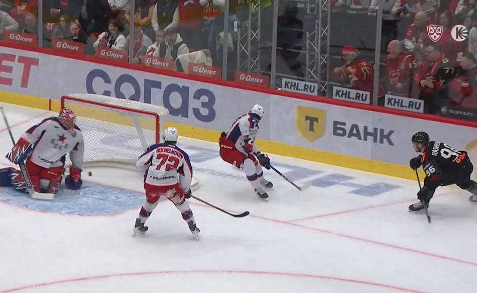 Второй период прошел при определенном преимуществе ЦСКА, но обошлось без голов, не помогли и удаления с обеих сторон. В начале третьей двадцатиминутки оборона «Авангарда» впервые допустила реальный ляп и форвард гостей, вклинившись меж двух защитников, расстрелял ворота Никиты Серебрякова — 2:1. За две с половиной минуты до сирены наставник «коней» Игорь Никитин заменил вратаря на шестого полевого — предоставив возможность сначала Окулову, а затем Майклу Маклауду атаковать пустые ворота. Ни тот, ни другой, правда, цель не поразили (первому в последний момент помешал игрок ЦСКА, а Мак просто не попал в ворота), но оба украли кучу времени у так и не состоявшегося по большому счету «армейского» штурма. Итого 2:1 в пользу «Авангарда» в матче и 4:1 в серии, Никитин пройден.